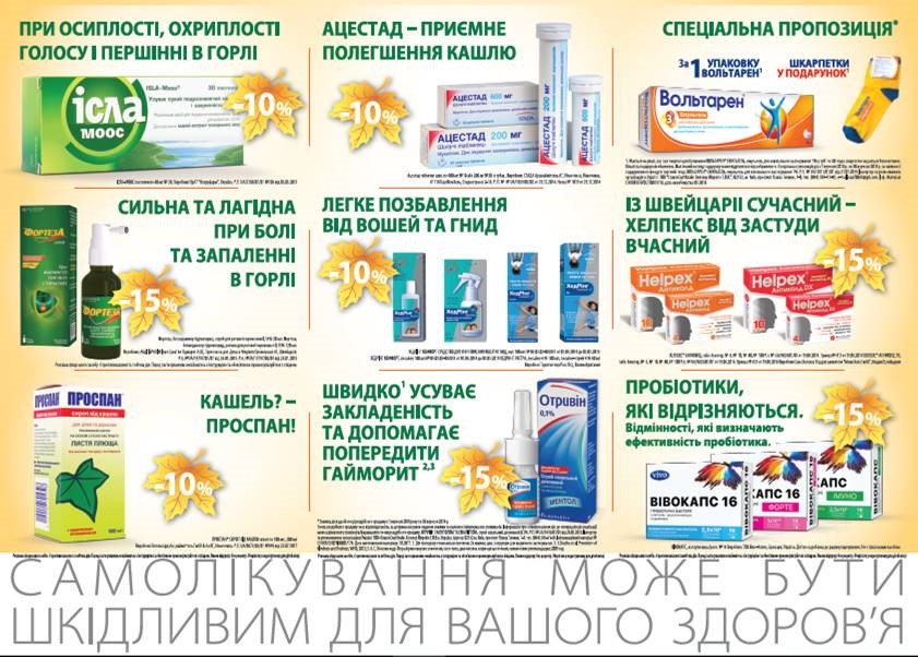 Специальное предложение действует с 1 сентября по 30 сентября 2018 или до окончания товарных запасов из акционного перечня во всех аптеках сети Домашняя Аптечка. Скидки рассчитываются согласно розничных цен, указанных на ценнике. Скидки по разным акциям не суммируются.
